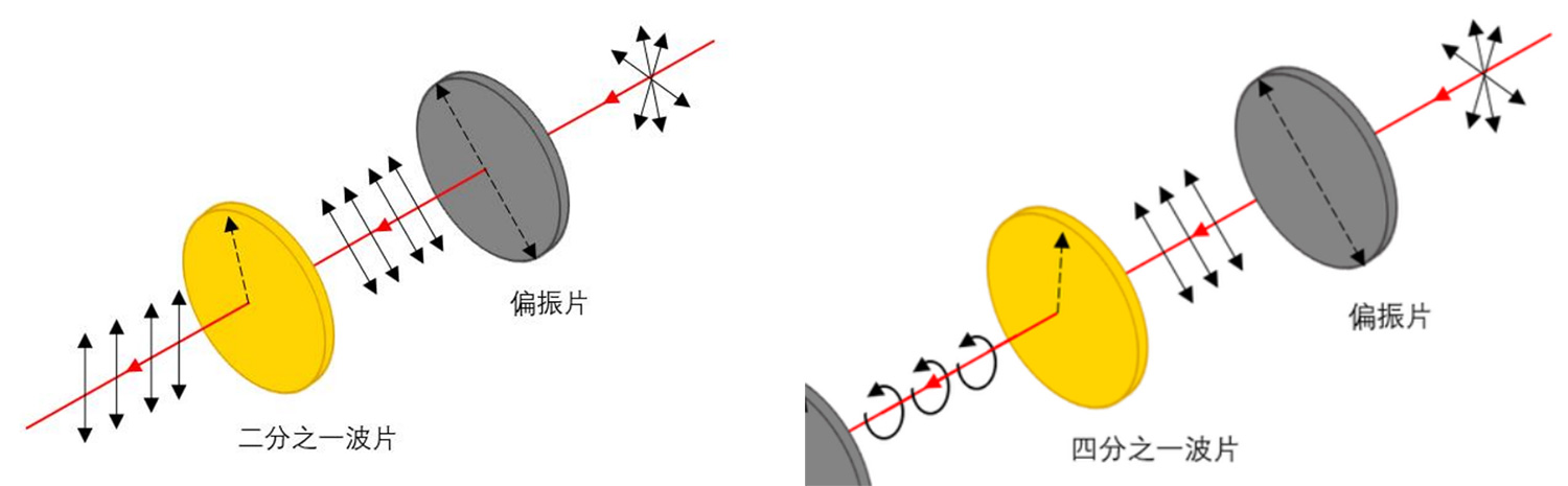 1/4波片是可以使线偏振光延迟1/4波长,使线偏振光转变成圆偏振光。相反的,它们也能把圆偏振光转变成线偏振光。与一个偏振分光棱镜组合后,1/4波片能被用在一种隔离器上。